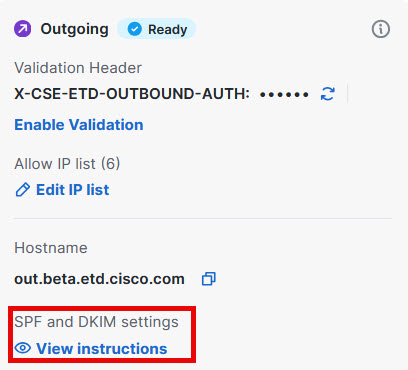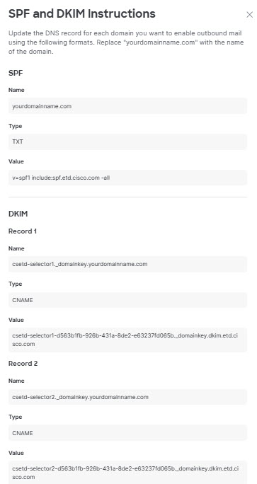 SPF and DKIM Signing instructions are shown in the Secure Email Threat Defense UI. These guidelines help you create domain-level DKIM signing keys and configure necessary DNS records. Update the DNS record for each domain you want to enable outbound mail analysis for, using the formats shown when you click View Instructions.