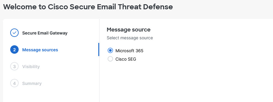 1. Select your message source: Microsoft 365 or Cisco SEG. If you selected No SEG in the previous step, Microsoft 365 is assumed as your message source and the wizard skips this step.