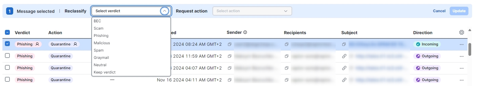 Select a verdict from the Reclassify drop-down menu. You can reclassify the messages as BEC, Scam, Phishing, Malicious, Spam, Graymail, or Neutral, or you can select Keep verdict.