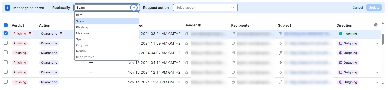 Select a verdict from the Reclassify drop-down menu. You can reclassify the messages as BEC, Scam, Phishing, Malicious, Spam, Graymail, or Neutral, or you can Keep verdict.