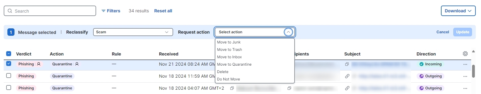 Select an action from the Request Action drop-down menu. You can Move to Junk, Move to Trash, Move to Inbox, Move to Quarantine, Delete, or you can select Do Not Move.