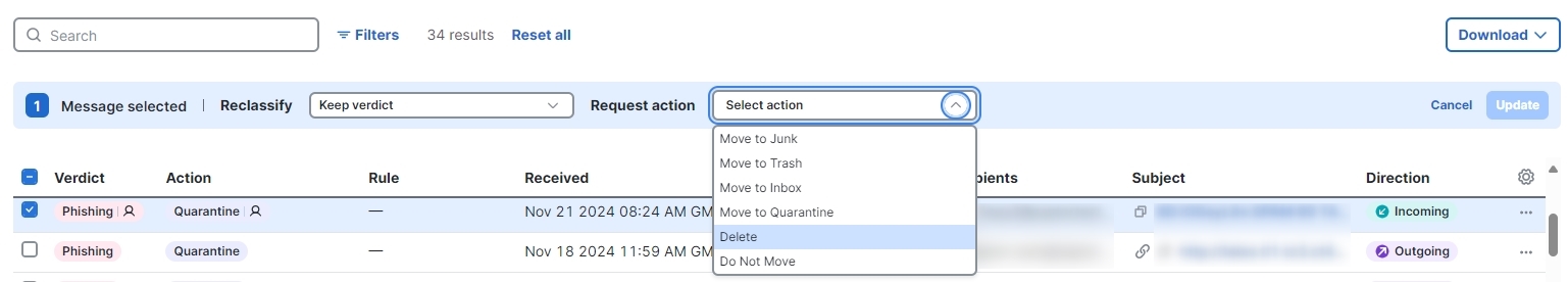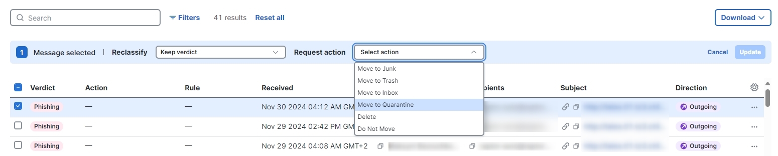 If you are in Read/Write remediation mode, you can move suspicious messages out of user Inboxes and into their Junk or Trash, or to a Quarantine folder they cannot access. Similarly, if you determine a message that was moved to Junk, Trash, or Quarantine is not suspicious, you can move it back to user Inboxes. You can also Delete messages entirely. This process also allows you to reclassify (apply a different verdict to) messages.