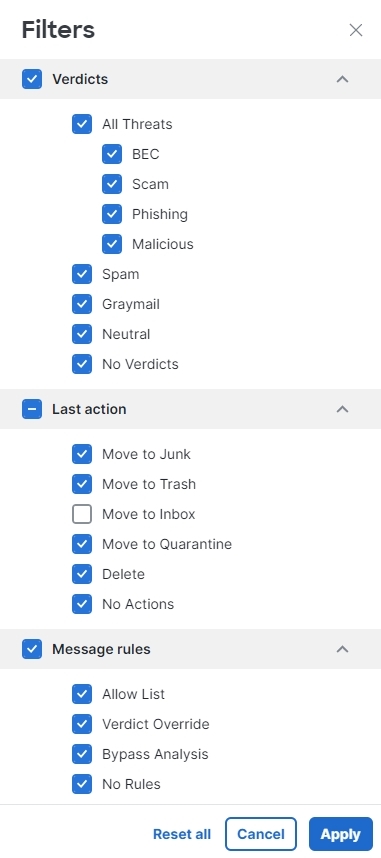 Use the filter panel to refine your search. For example, you may want to see all mail sent from a specific sender, mail with a specific verdict, mail with attachments or links, mail that has been reclassified, mail that has been moved to Junk, and so on.