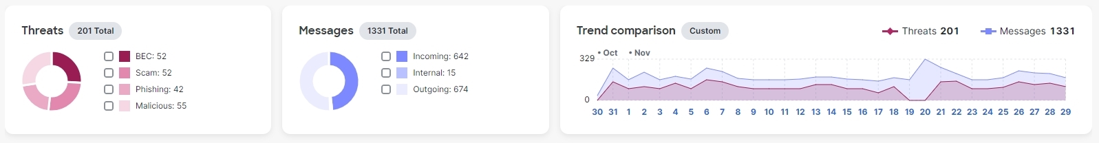 A Threat and category breakout to view totals and easily filter for threats.
